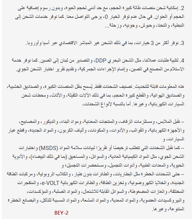China and Lebanon trading amount was once over US$1.5 billion. Lebanon imports machine, electronics, textile and others. Service in door to door can be arranged(DAP/DDU/DDP) by air freight.