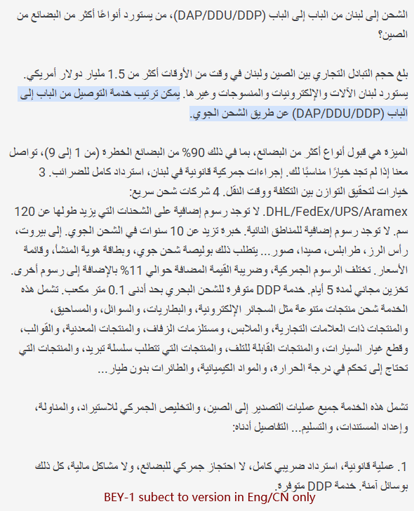 To Beirut,Ra's Bayrut,Tripoli,Sidon,Tyre..It needs air waybill, origin CI and PL. Customs duties are different, VAT about 11% plus some others. 5 days free storage. DDP available in sea freight with minimum charge 0.1CBM. It takes vape, battery, liquid, powder, brand, clothes, bridal, metal products, molds, auto parts, and, perishable, cold chain, temperature-control, chemical, UAV....(Subject to version in Eng/CN only if not of them for below).